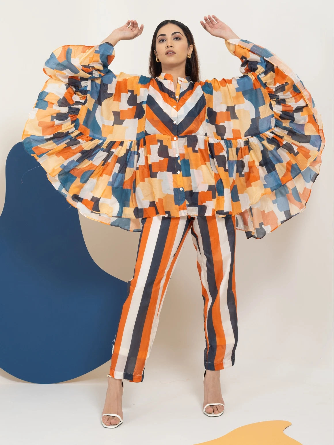 A stunning coord set that blends bold prints and vibrant stripes seamlessly. The top boasts an artistic abstract pattern with playful hues of orange, blue, and beige, while the straight-fit trousers add a modern twist with their bold vertical stripes.